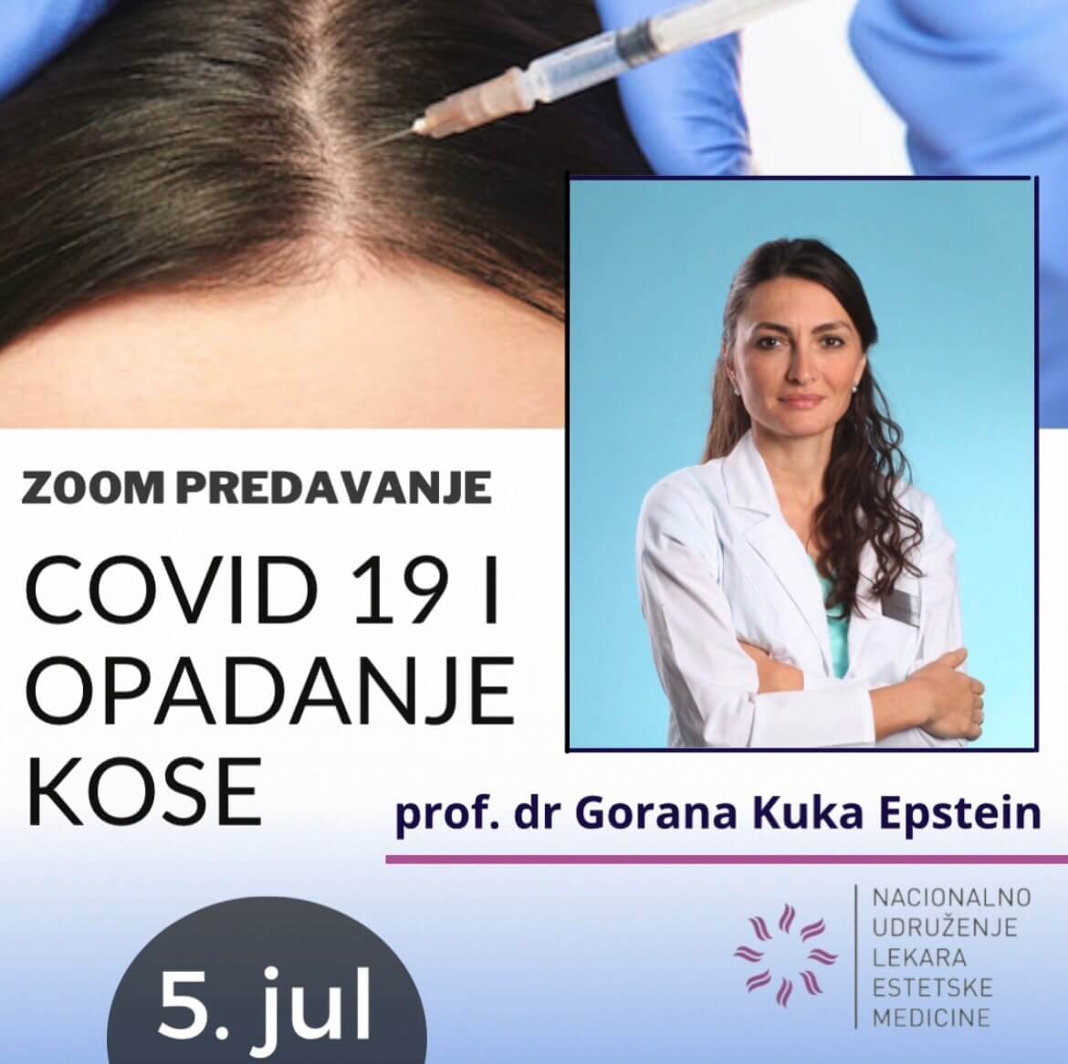 Na osnovu člana 139, stav 1 , tačka 6 zakona o zdravstvenoj zaštiti , zdravstveni savet je doneo odluku o akreditaciji programa kontinuirane edukacije u julskom roku 2021.godine. Članovi NULEM-a imali su prilike da prisustvuju prvom predavanju na temu „COVID 19 i opadanje kose„. Predavanje je održala prof.dr Gorana Kuka Epstain, jedan od pionira FUE (Follicular Unit Excusion) metode transplatacije kose ne samo u Srbiji, već i u svetu. Sa preko 3000 FUE transplantacija tokom višegodišnjeg rada , ubraja se u svetske stručnjake i lidere u ovoj oblasti medicine. Redovni je predavač na svetskim kongresima i član je nekoliko svetskih udruženja za transplataciju kose.Kalendar edukacija